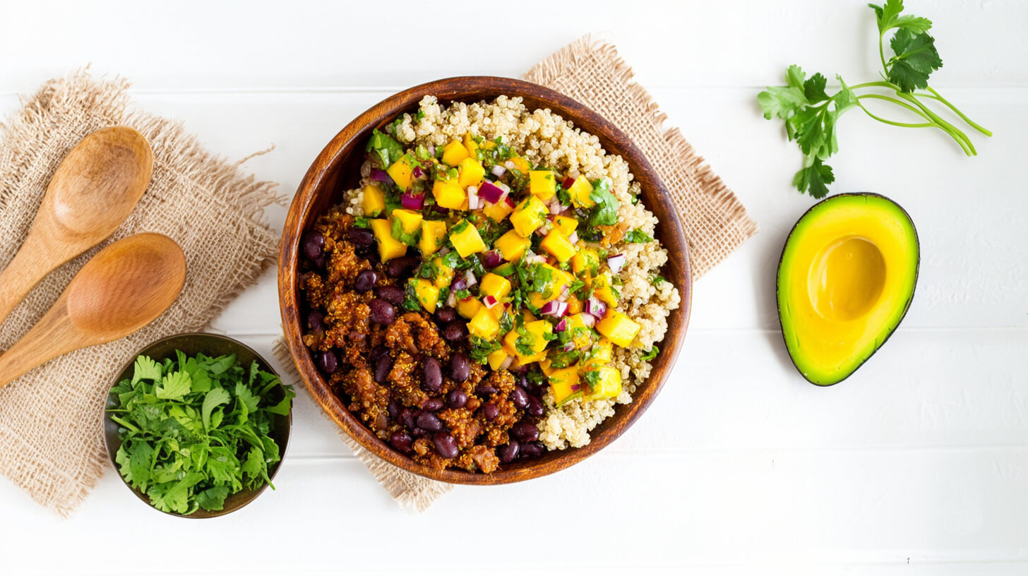 Bowl z czarną fasolą, komosą ryżową oraz salsą z mango i awokado