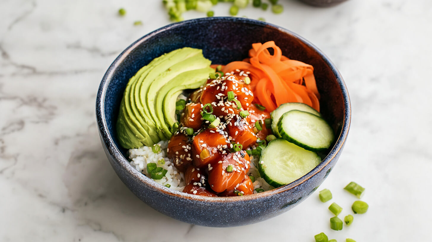 Surowa ryba w diecie? To składnik, który znajdziemy m.in. w kuchni japońskiej. A także w naszym przepisie na bowl z surowym łososiem. Główną rolę gra tu surowy łosoś w aromatycznej, wyrazistej marynacie na bazie miodu, limonki, teriyaki, sosu sojowego i oleju sezamowego. Do tego warzywa, imbir, szczypiorek, sezam i gotowe. Czeka na Ciebie danie pełne kwasów omega-3, witaminy D, białka oraz błonnika. Smacznego!