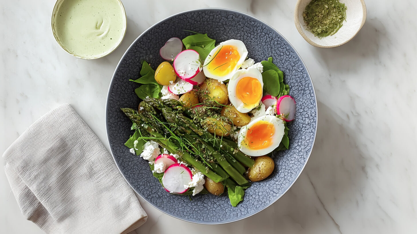 Układamy obok siebie poszczególne składniki: ciepłe ziemniaki, usmażone szparagi, plasterki rzodkiewki oraz połówki jajek, dbając o to, by każda sekcja była wyraźnie oddzielona.