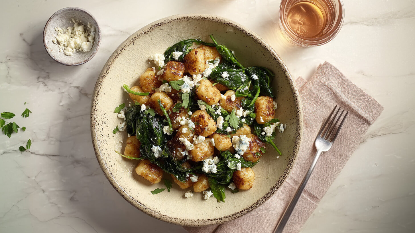 Obiad z wykorzystaniem gotowców to super opcja dla zapracowanych. Fantastycznie sprawdzi się np. gnocchi ze szpinakiem i fetą, czyli połączenie gotowych gnocchi z czosnkiem, fetą, szpinakiem oraz natką pietruszki. To świetny przepis dla fanów klasyki i prostoty w kuchni. A do tego źródło wapnia, witaminy C, żelaza czy wapnia. Smacznego!