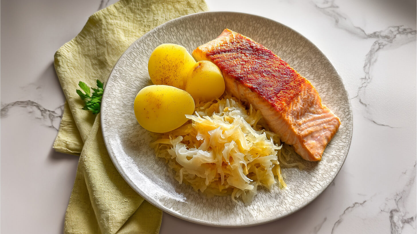 Gotowe ziemniaki z łososiem i kapustą kiszoną