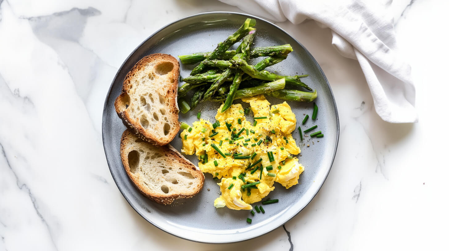 Wykładamy gorące szparagi oraz zrumienione grzanki na jedną stronę talerza, a obok układamy puszystą jajecznicę.