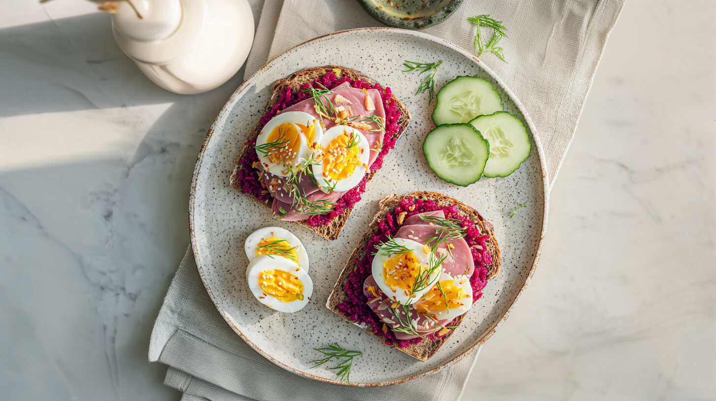 Na każdej kromce równomiernie rozsmarowujemy ćwikłę. Na ćwikle układamy plastry wędliny. Na wędlinie układamy plasterki jajka. Całość posypujemy koperkiem. Doprawiamy solą i pieprzem według własnego uznania.