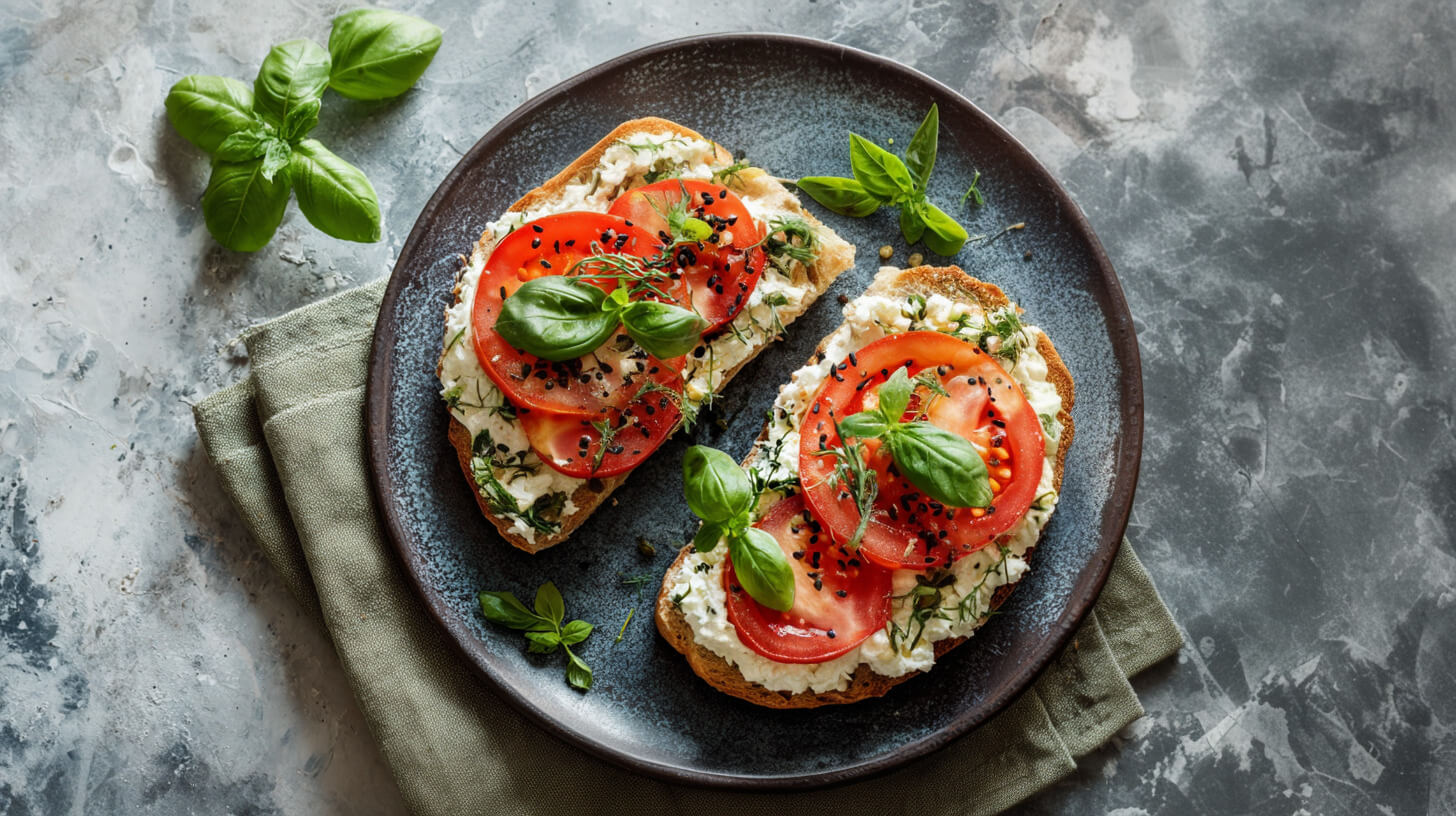 Na przygotowane kromki pieczywa nakładamy grubą warstwę kremowego twarożku. Na wierzchu układamy plastry pomidora. Całość posypujemy nasionami czarnuszki oraz świeżo mielonym pieprzem. Dekorujemy listkami świeżej bazylii.