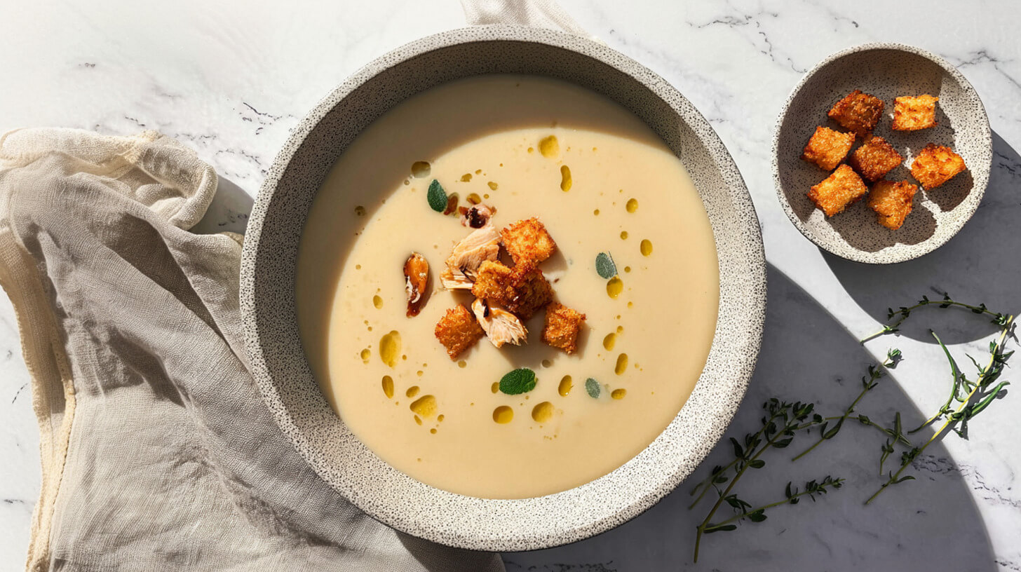 Krem z pieczonego selera i gruszki z grzankami razowymi
