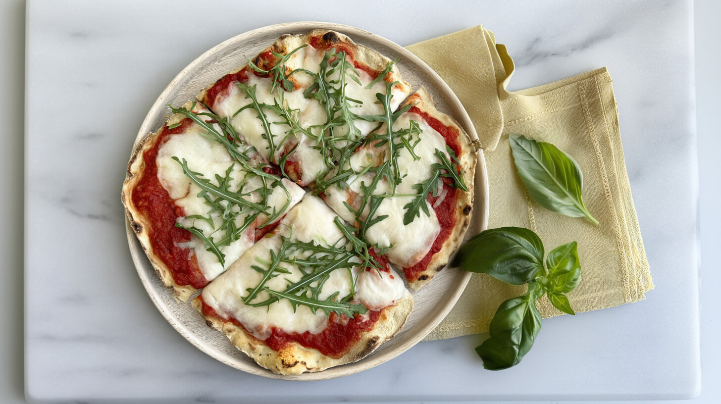 Pinsa z sosem pomidorowym, mozzarellą i rukolą
