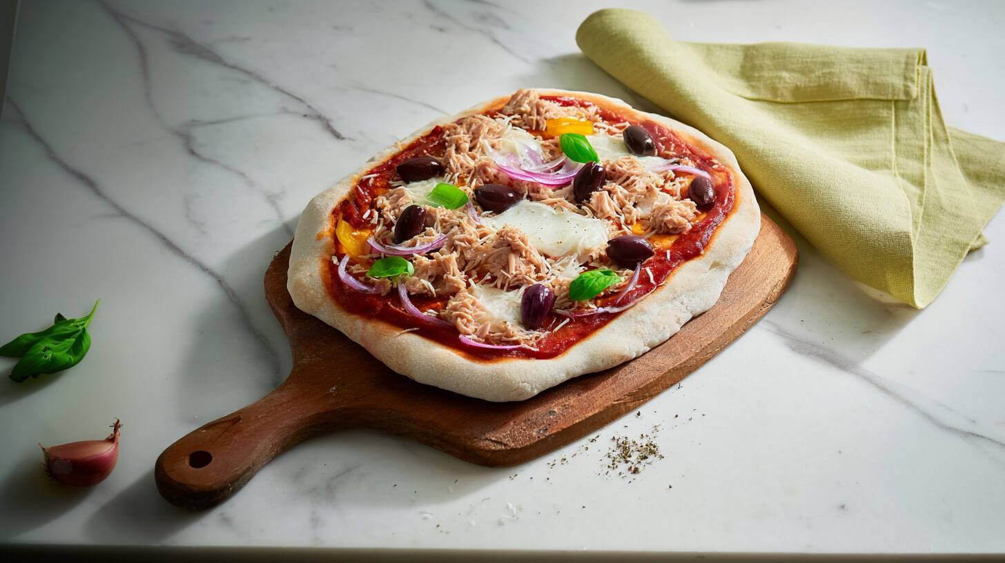 Pizza w fit wersji? Mówisz i masz! Pinsa z tuńczykiem i cebulą to idealny przepis, gdy szukasz pomysłu na fast food, który na spokojnie można włączyć do zdrowej diety. Wystarczy, że połączysz puszystą pisnę z dodatkami – w tym mozzarellą, warzywami, tuńczykiem oraz sosem pomidorowym, a całość zapieczesz. To naprawdę prosty posiłek pełen kwasów omega-3, białka, witaminy C czy wapnia. I idealny sposób, by zaspokoić apetyt na żywność typu fast food. Koniecznie wypróbuj, smacznego!