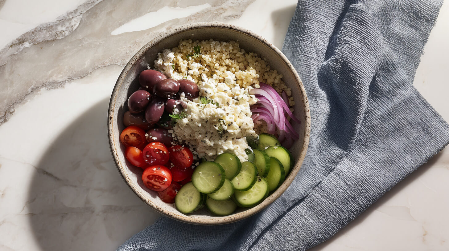 Gotową kaszę przekładamy do głębokiego talerza lub miski. Obok kaszy układamy przygotowane warzywa oraz oliwki, a na samym środku kładziemy twarożek.