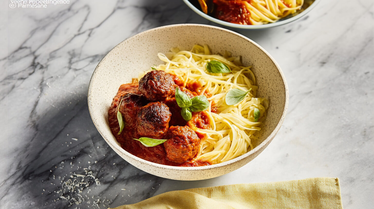 Wegetariańskie klopsiki w sosie pomidorowym z makaronem