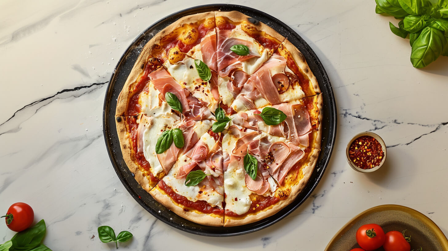 Przed podaniem smarujemy passatą, układamy kawałki szynki i posypujemy startym serem. Dekorujemy świeżą bazylią.
