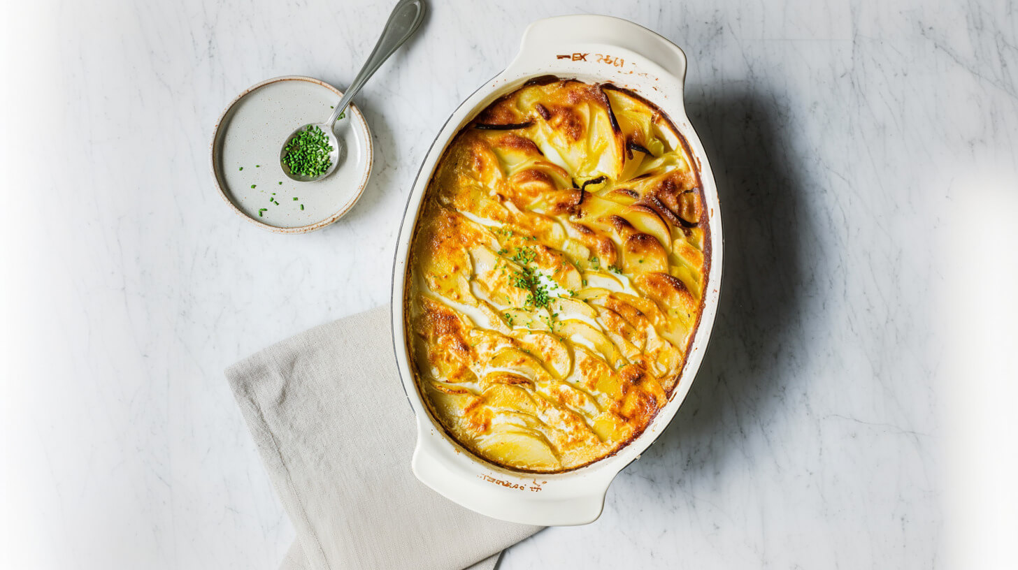 Zapiekanka ziemniaczana z porem, wędzonym tofu i sosem beszamelowym
